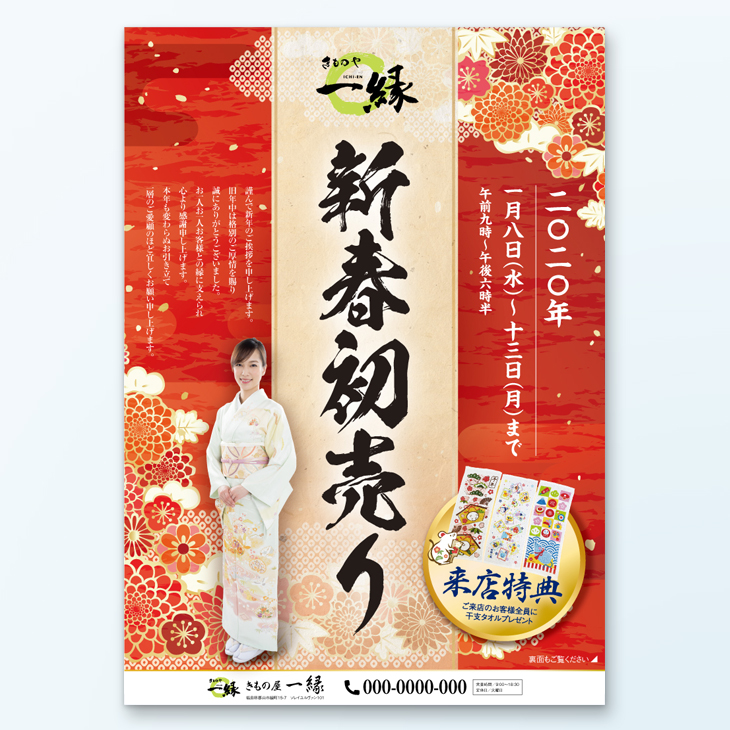 着物販売B4サイズ両面カラーチラシデザイン事例初売りキャンペーン紹介、来店特典訴求チラシ作成専門 デザイン +印刷のCHIRASAKU チラサク。