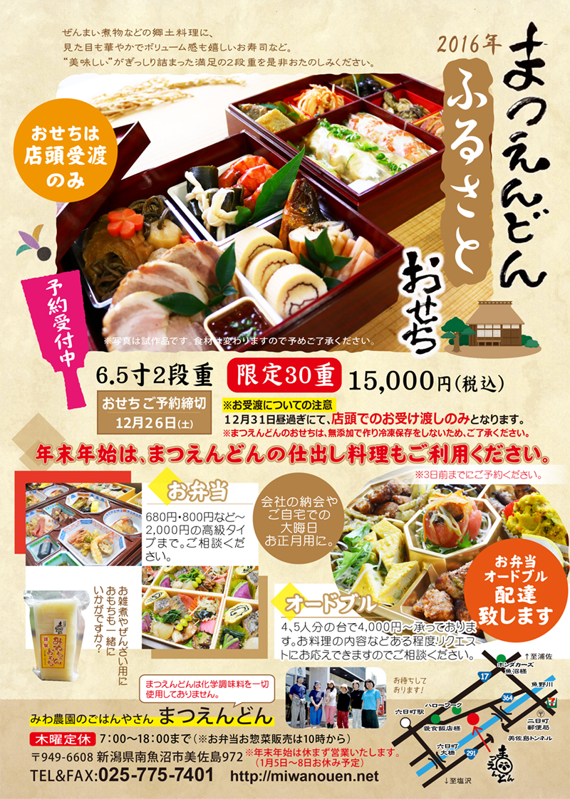 まつえんどん様 おせち撮影&チラシ作成 南魚沼市– 南魚沼デザイナーアカネデザイン 制作事例。