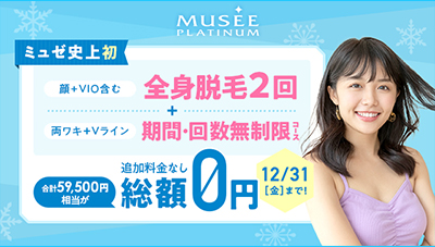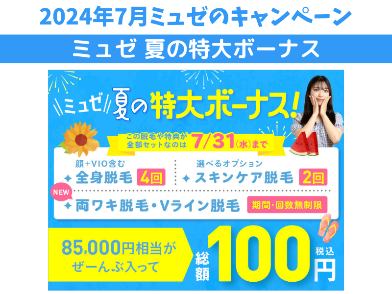 100円で全身脱毛+両ワキ・Vライン2年通い放題!ミュゼ7月キャンペーン情報。