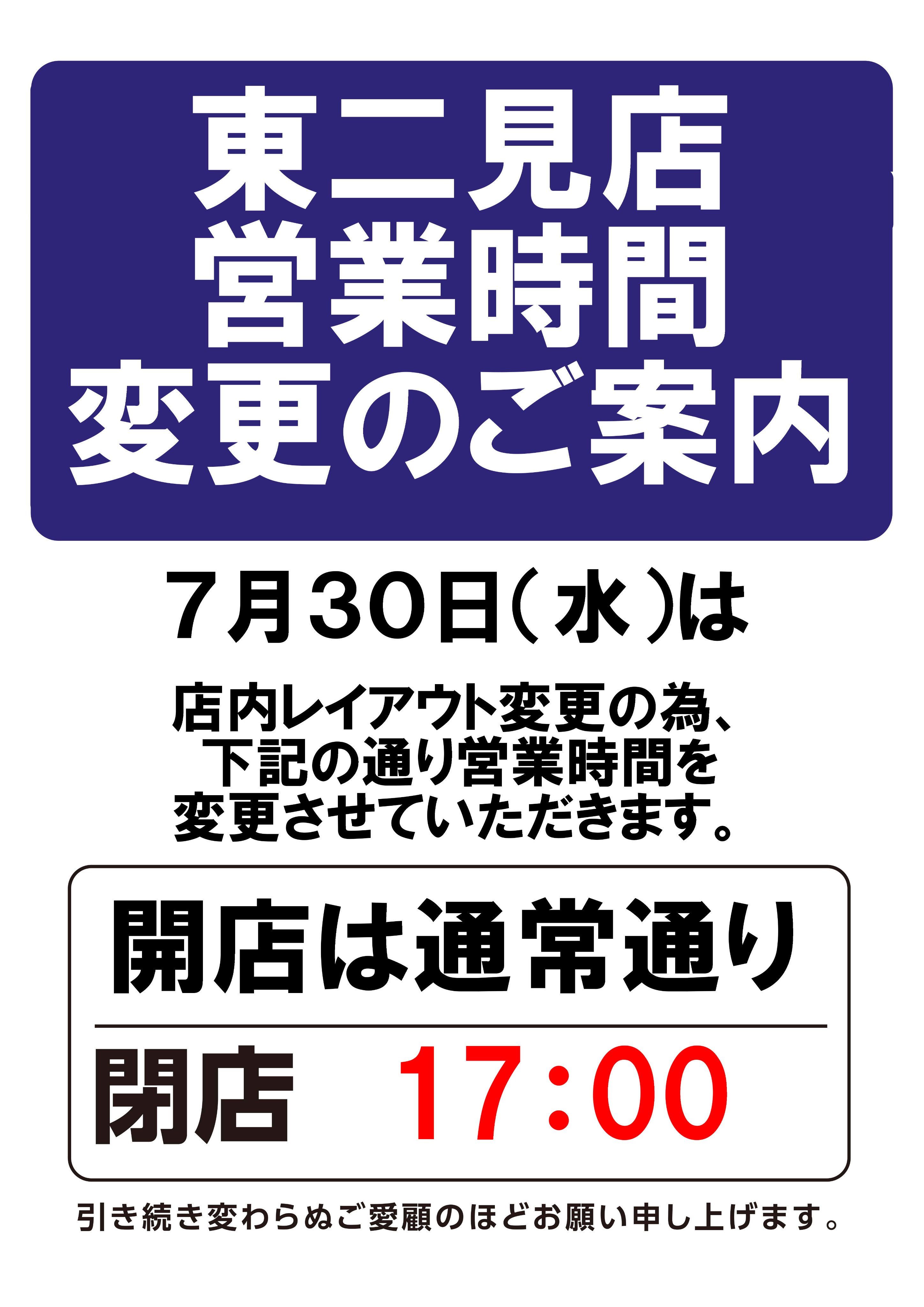❤️💙💚🌱株式会社マルアイ 公式on X: " 東二見店営業時間変更のお知らせ7月30日 水 は店内レイアウト変更のため、閉店時間を 夕方17時 に変更します。 翌日は通常通り営業致します。 お客さまにはご不便をおかけいたしますが、 何とぞご理解とご協力をお願い。