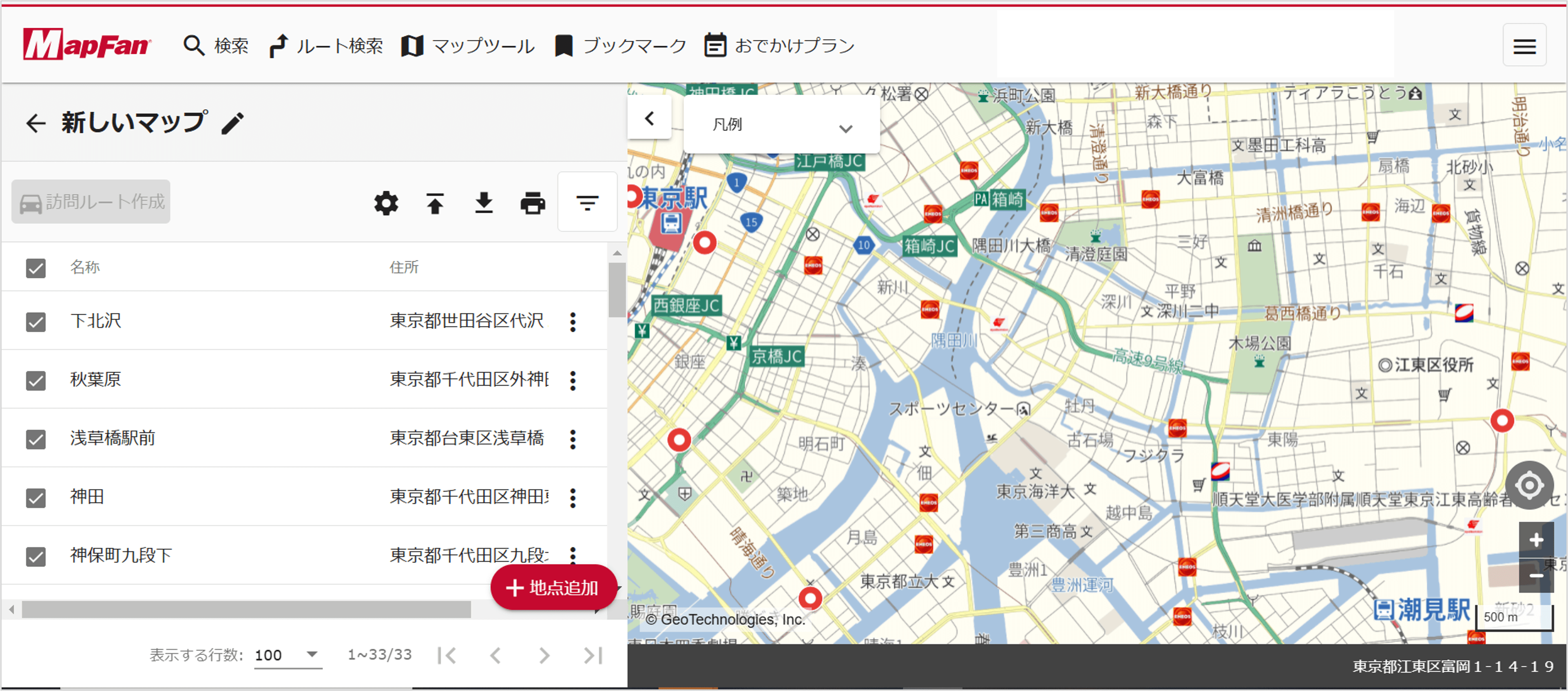 最大30地点を効率よく回れる!配達や営業回りに便利なMapFanの『マップツール』ジオテクノロジーズ MAP WORLD+。