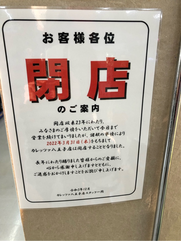 2022年3月31日に『カレッツァ』『2りんかん』が同時に閉店予定八王子ジャーニ。