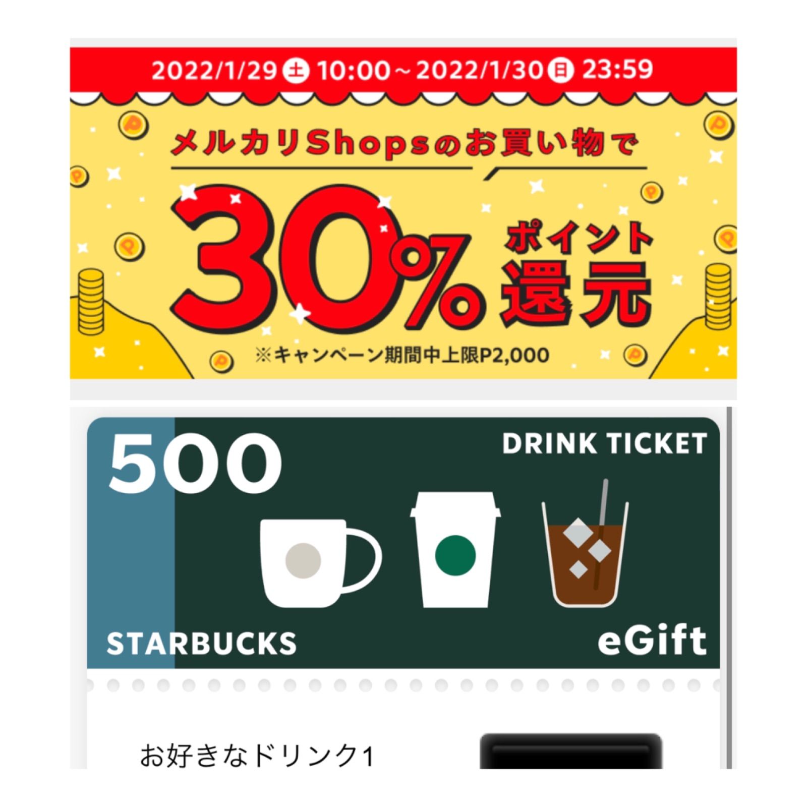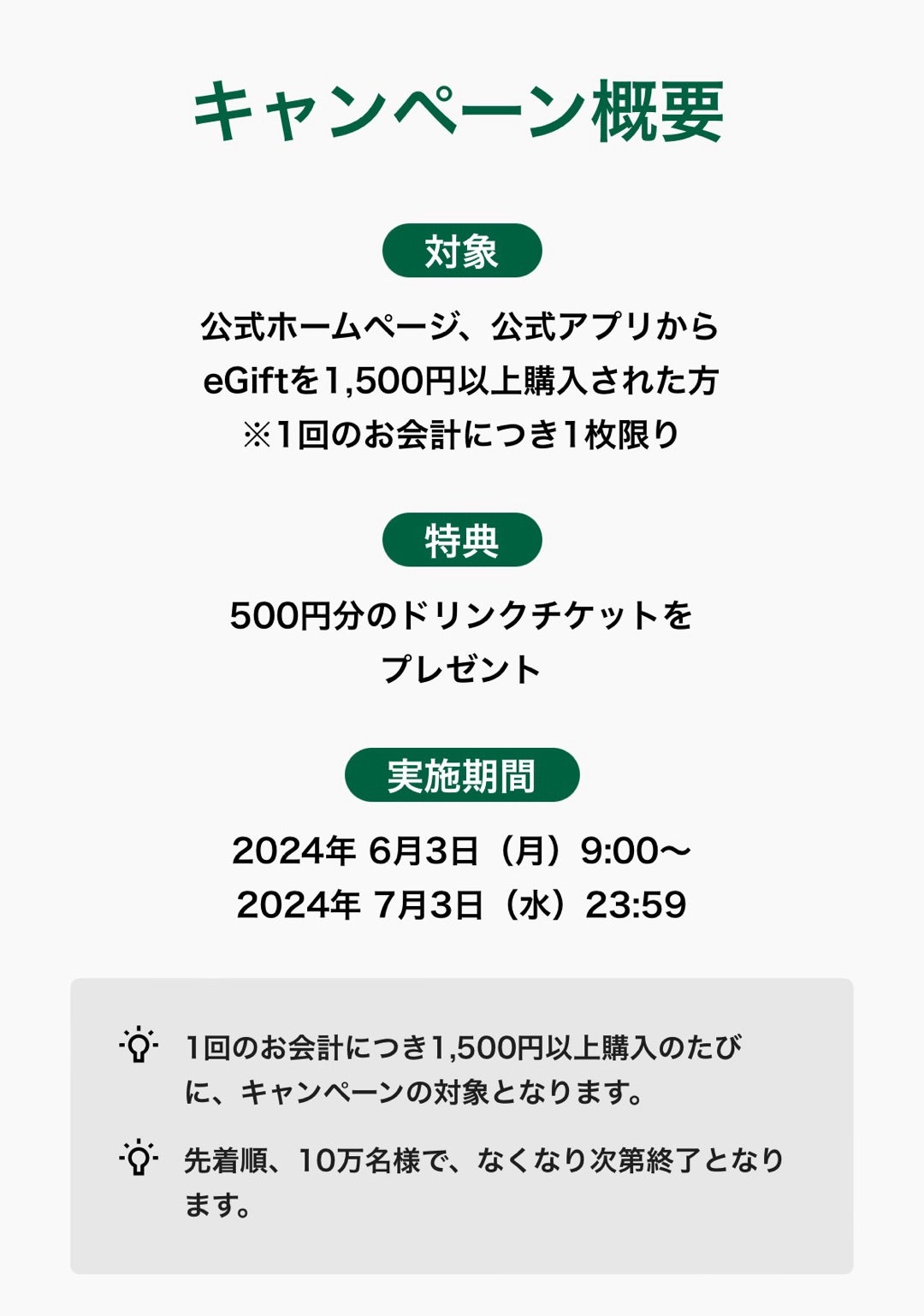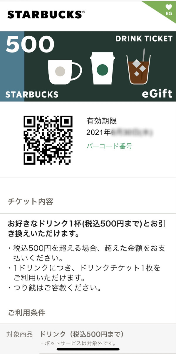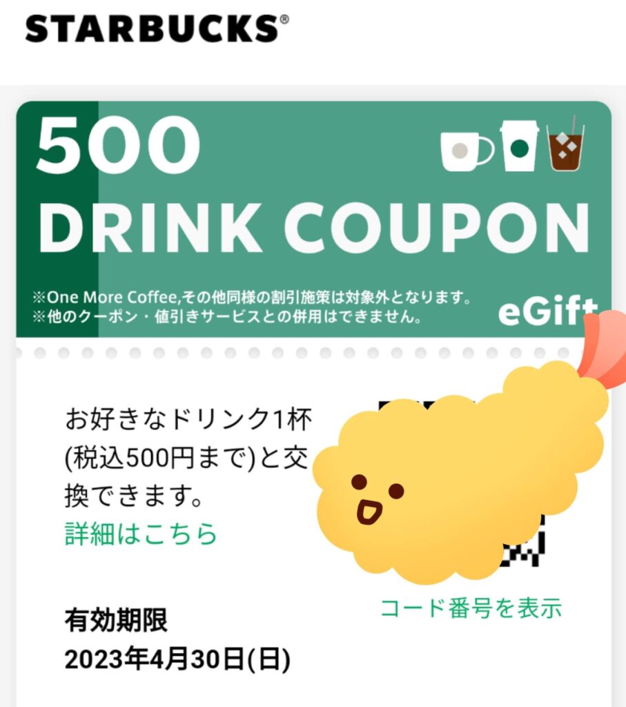 スタバのeギフト500円以上購入でドリンクチケット獲得。