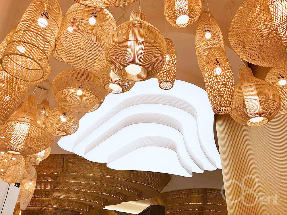 膜製のデザインライトを大阪万博・インドネシア館内の天井へ施工丸八テント商会。