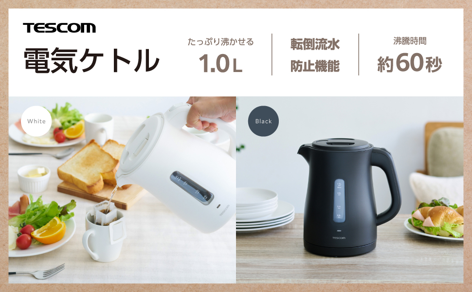 テスコム TESCOMTKE30A-W ホワイト電気ケトル 1.0L1200W急速沸騰 転倒お湯もれ防止 空焚き防止 蒸気抑制構造自動OFF 二重構造 うっかり倒してもお湯がこぼれにくいから安心!転倒流水防止機能付きの「電気ケトル」を新発売美容・キッチン家電のテスコム。