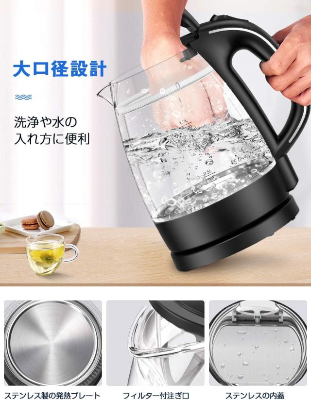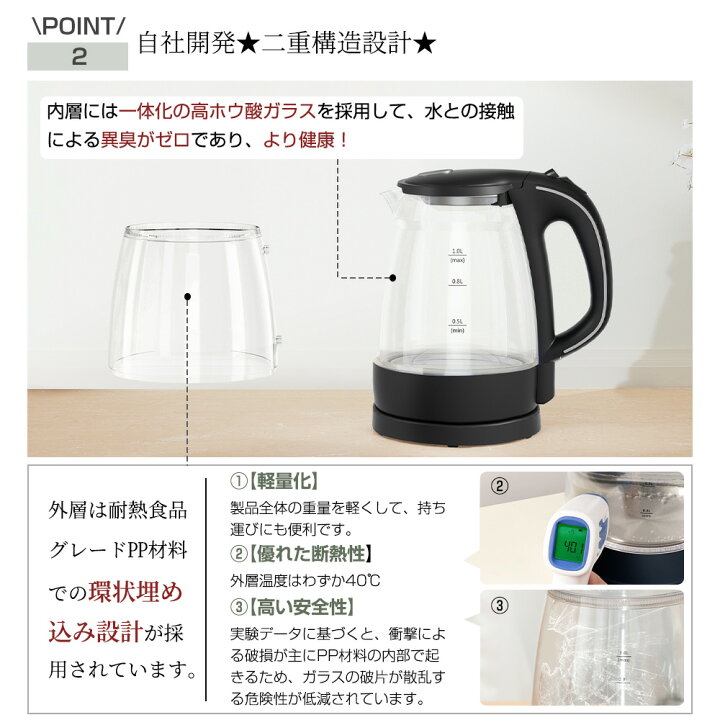 ケトル 断熱一体型火傷防止電気ケトル、二重ポット本体、三層高速色 : ブラックプレゼントブラックAmazon.co.jp:二重構造・火傷防止 HAGOOGI電気ケトル ガラス ケトル 透明 大容量 1L 耐熱ガラス 触れても熱くない 湯沸かし ケトル 急速沸騰 LEDライト付き。