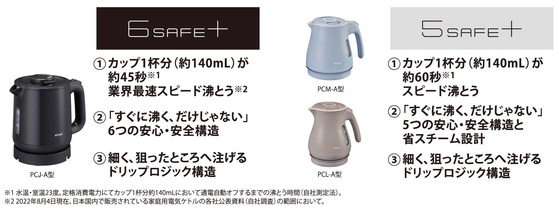 沸とうスピード・安全構造・使い心地を追求した人気シリーズにトレンドを意識した新色が登場!電気ケトル<6SAFE+><5SAFE+>から3製品を発売タイガー魔法瓶株式会社のプレスリリース。