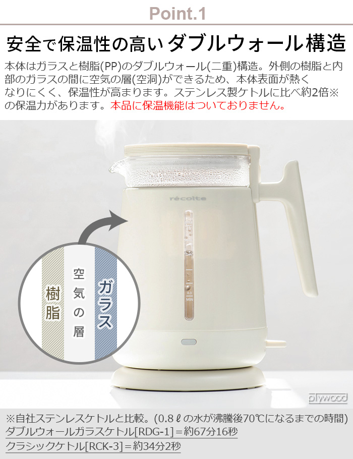 楽天市場選べる特典付電気ケトル ガラス おしゃれ 二重構造レコルト ダブルウォールガラスケトル RDG-1recolte DoubleWall Glass Kettle電気ポット 熱くならない 空焚き防止機能 0.8L 一人暮らし◇新生活 湯沸かし器 ギフト 送料無料 P10倍 :plywood キッチン。