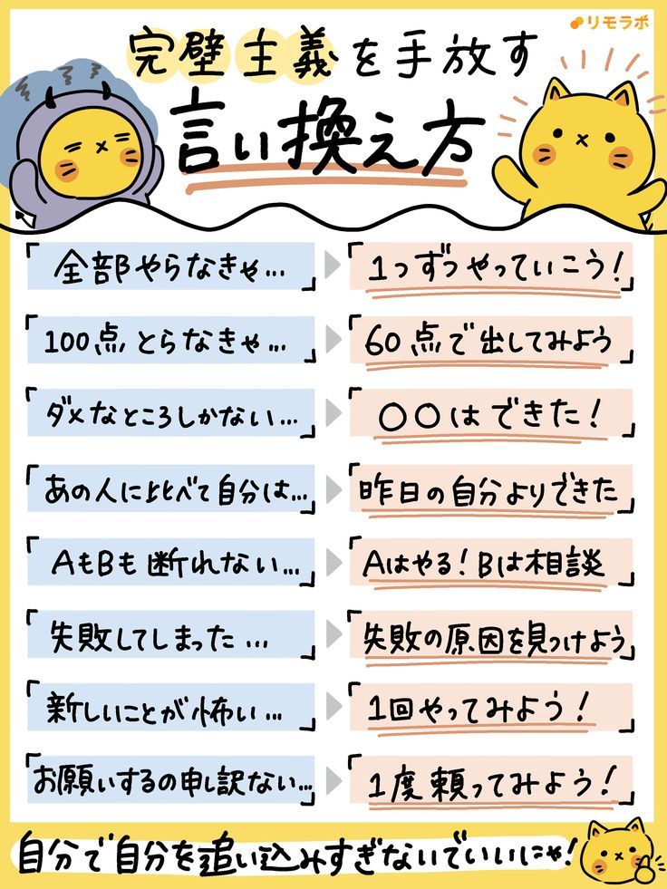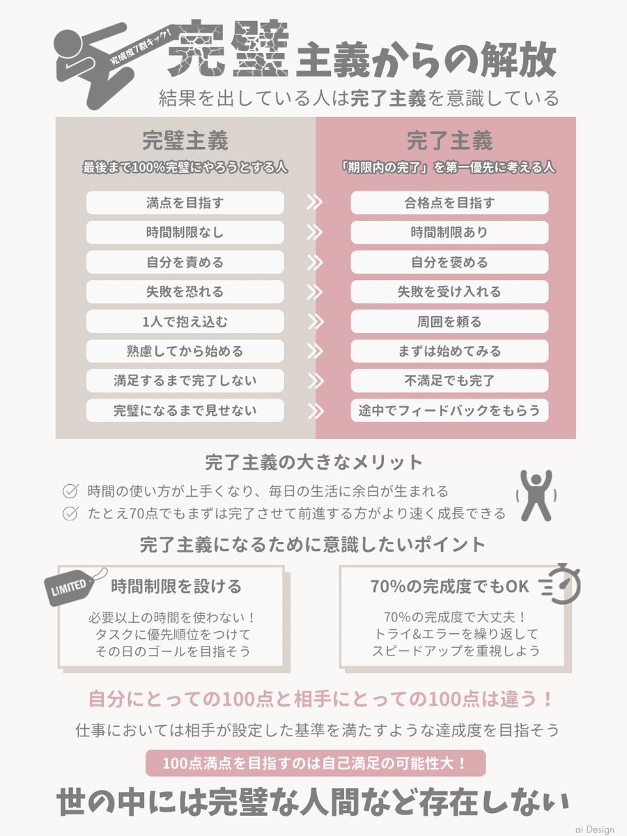 あい on X: "27完璧主義からの解放できないくせに完璧主義これに昔から長年苦しんできました。 完璧でなければいけない。失敗して恥ずかしい思いをしたくない。 自分で自分の首を絞めていました。 図解連続投稿をはじめてから 「完了思考」が意識できるように。