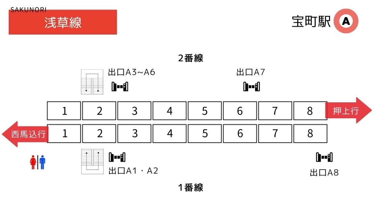 宝町駅都営浅草線改札に近い乗車位置 - SAKUNORI。