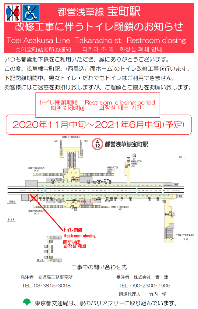 都営浅草線宝町駅トイレ閉鎖のお知らせ東京都交通局。