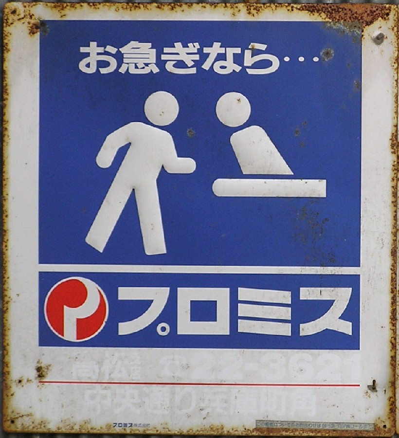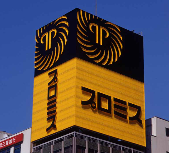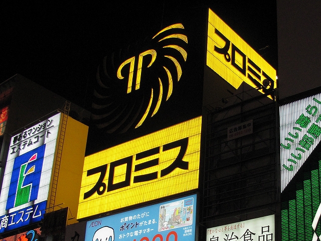 昔、梅田にあったプロミスの看板。 なぜ斜めなのかという理由の面白い説。 1.信頼のおける工事業者に施行を依頼したが、工事業者のミスで看板 が斜めになってしまった。工事のプロでもミスをする、すなわちプロミスなのでそのままにしておいた。 2.看板は写真のように3面体。