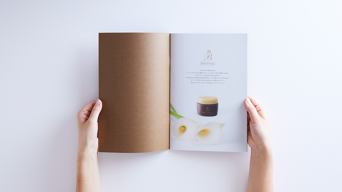 パンフレット制作事例 – コスメブランドの商品紹介パンフレットデザインパンフレット作成の依頼はASOBOADカタログデザイン制作実績,二つ折りパンフレット リーフレット 制作実績。