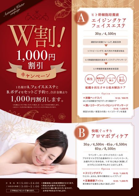 サロン パンフレット 女性向けのパンフレット印刷,薔薇デザインの高級感チラシ,サロンの割引券美容チラシリーフレット・パンフレット 作成-エステ・ネイル・クリニック・ヘアサロン。