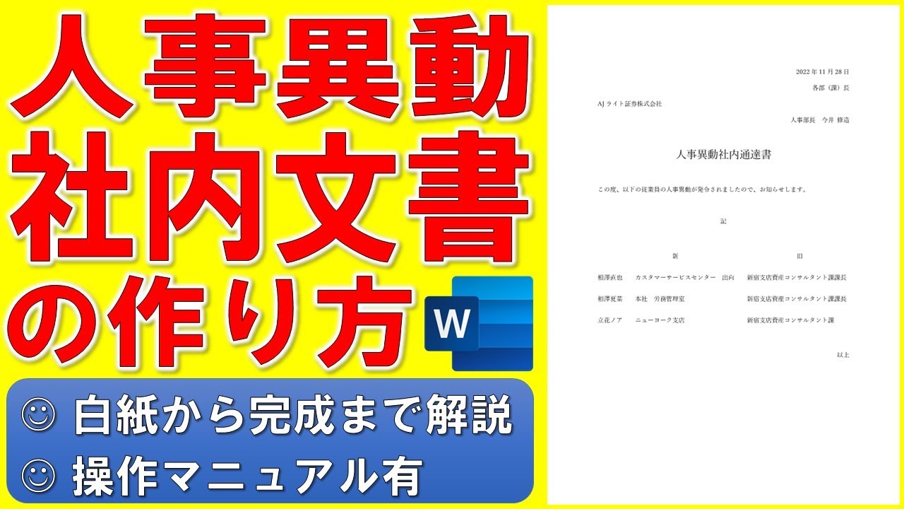Wordで人事異動の社内文書を作る方法★ビジネス文書の作成方法★社内通達書の作り方★左揃えタブ、ドラマ「あなたは私におとされたい」参考★白紙から始めて完成までノーカットで解説★操作マニュアル有。