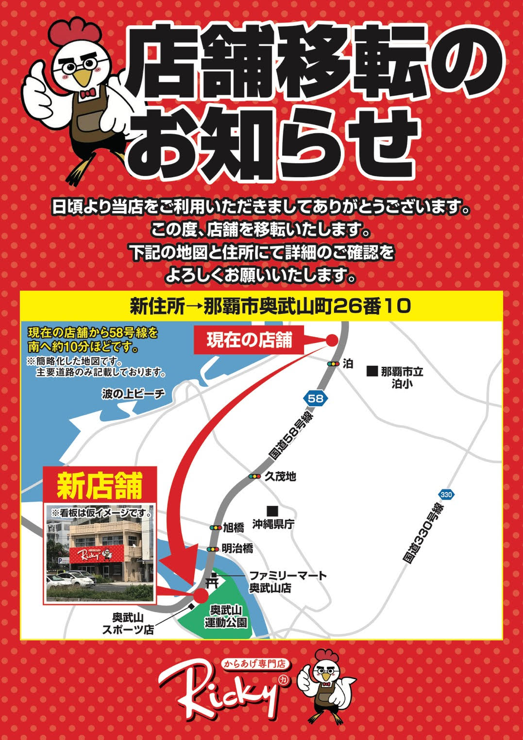 移転のお知らせ - Ricky からあげ専門店Ricky fried chicken specialist storesRicky 치킨전문점。