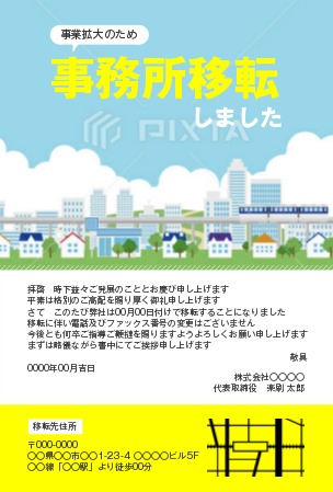 おしゃれなデザイン「事務所移転のお知らせ」ハガキやメール、ホームページの掲示画像に活用! イラストボックス「プレミアム」テンプレート。