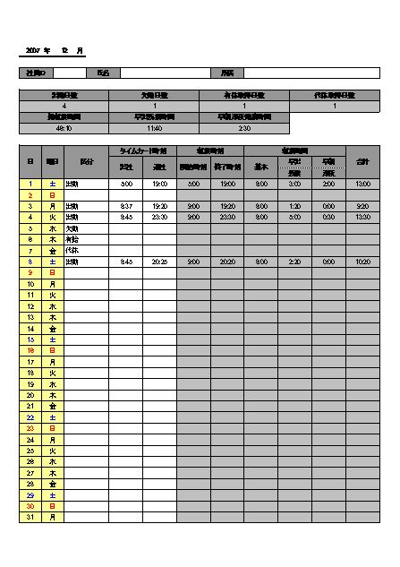 Excelで自動計算できる出勤簿のテンプレート2書式を無料ダウンロード生活の便利技。