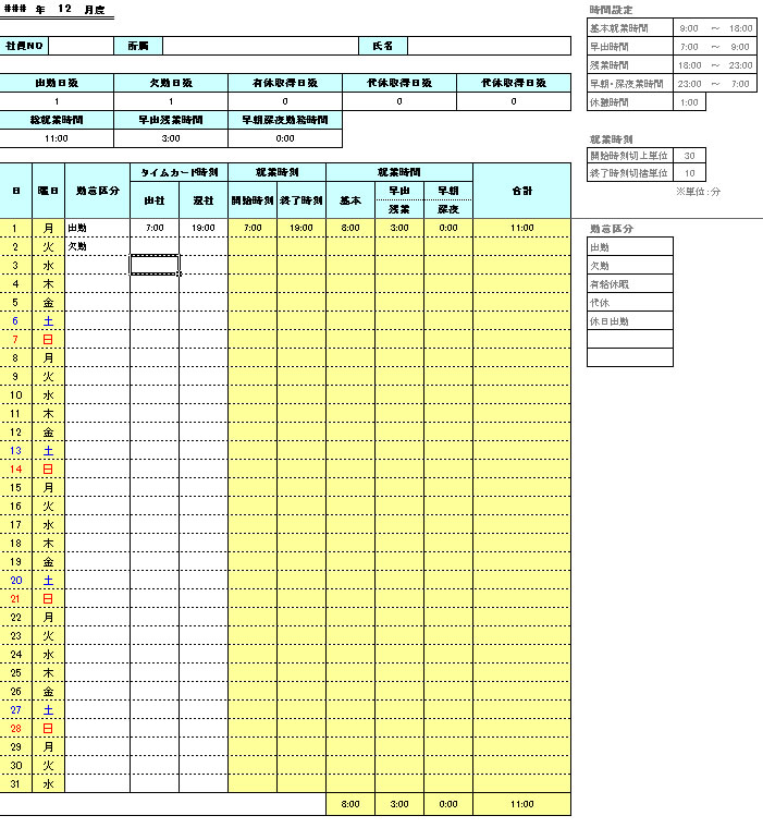 社員の勤務時間計算用テンプレート 「自動計算できるEXcel形式の勤怠管理表」EXCEL勤怠テンプレート。