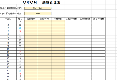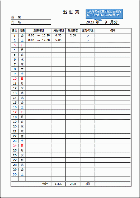 出勤簿Excelフォーマットを無料DL・自動計算・日付曜日自動。