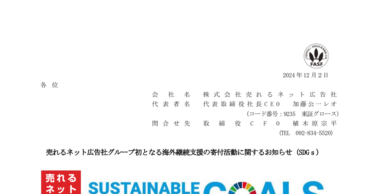 売れるネット広告社グループ 9235 :売れるネット広告社グループ初となる海外継続支援の寄付活動に関するお知らせ SDGs2024年12月2日 適時開示:日経会社情報DIGITAL:日本経済新聞。