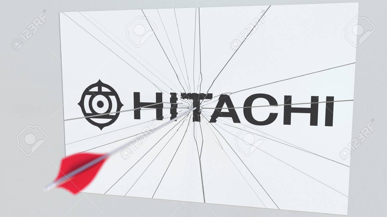 アーチェリーの矢は日立ロゴのプレートをヒット。企業問題 概念編集 3D レンダリングの写真素材・画像素材 Image 120107547。