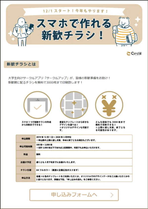 スマホで作れる新歓チラシ!」大学生向けのサービスを開始 広告付きなら3,000枚まで無料作成・印刷が可能に株式会社ユーキャンパスユース。