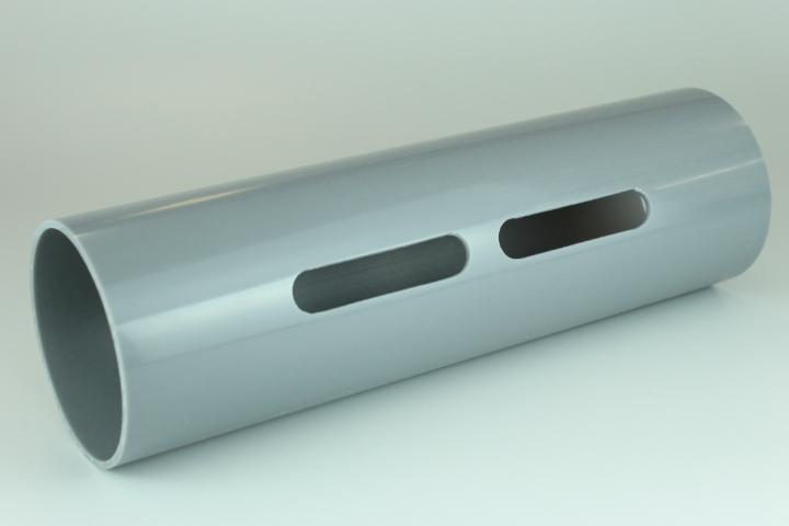 塩ビ管の穴加工品、VP管、VU管、PVC、グレー、愛知県、福岡県、栃木県、埼玉県 - 株式会社 宮田工業所。