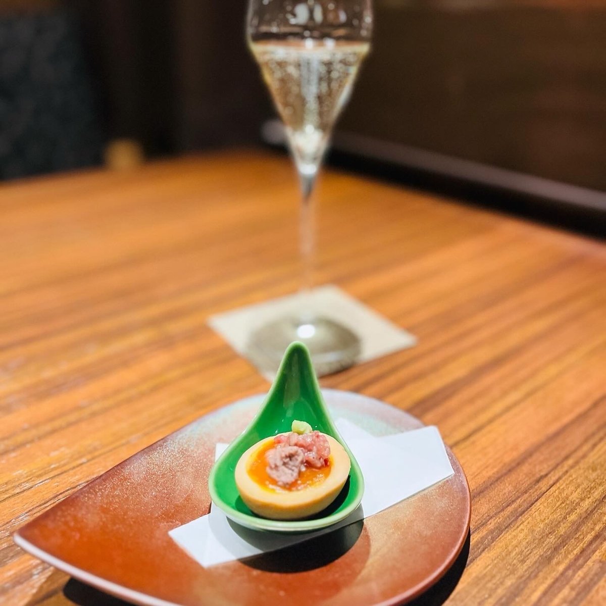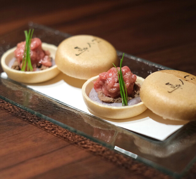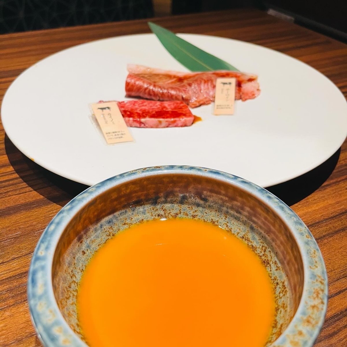 銀座焼肉 にく崎」銀座 東京で唯一生レバーがいただける🥺🧡銀座焼肉ならにく崎さん✨!! 銀座駅から歩いて5分ほどのところにある 銀座焼肉 にく崎さん! 今回いただいたのは、にく崎 頂 コース 14300円 ! おもてなし ・和牛ユッケと紫芋の最中 向付 ・"和牛と旬。
