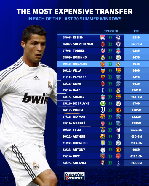 過去20年の夏ウィンドーで支払われた移籍金最高額は?Transfermarkt。