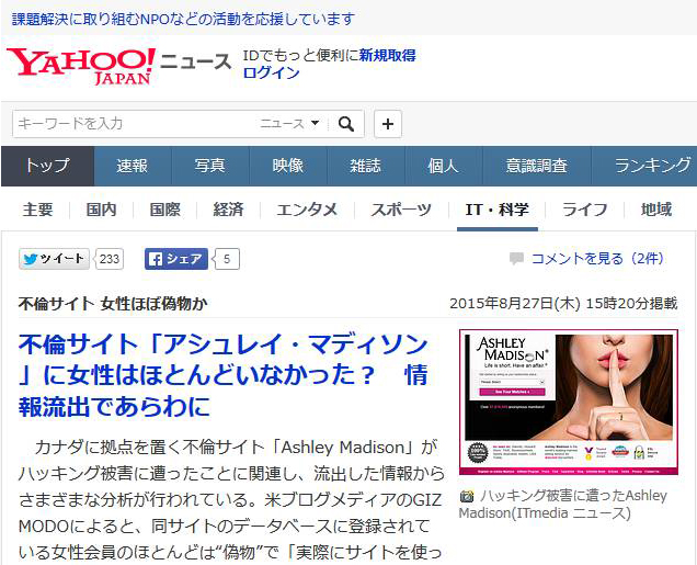 不倫サイト「アシュレイ・マディソン」に女性はほとんどいなかった? 情報流出であらわに 8月27日– 私の人生、私のもの。 新館。