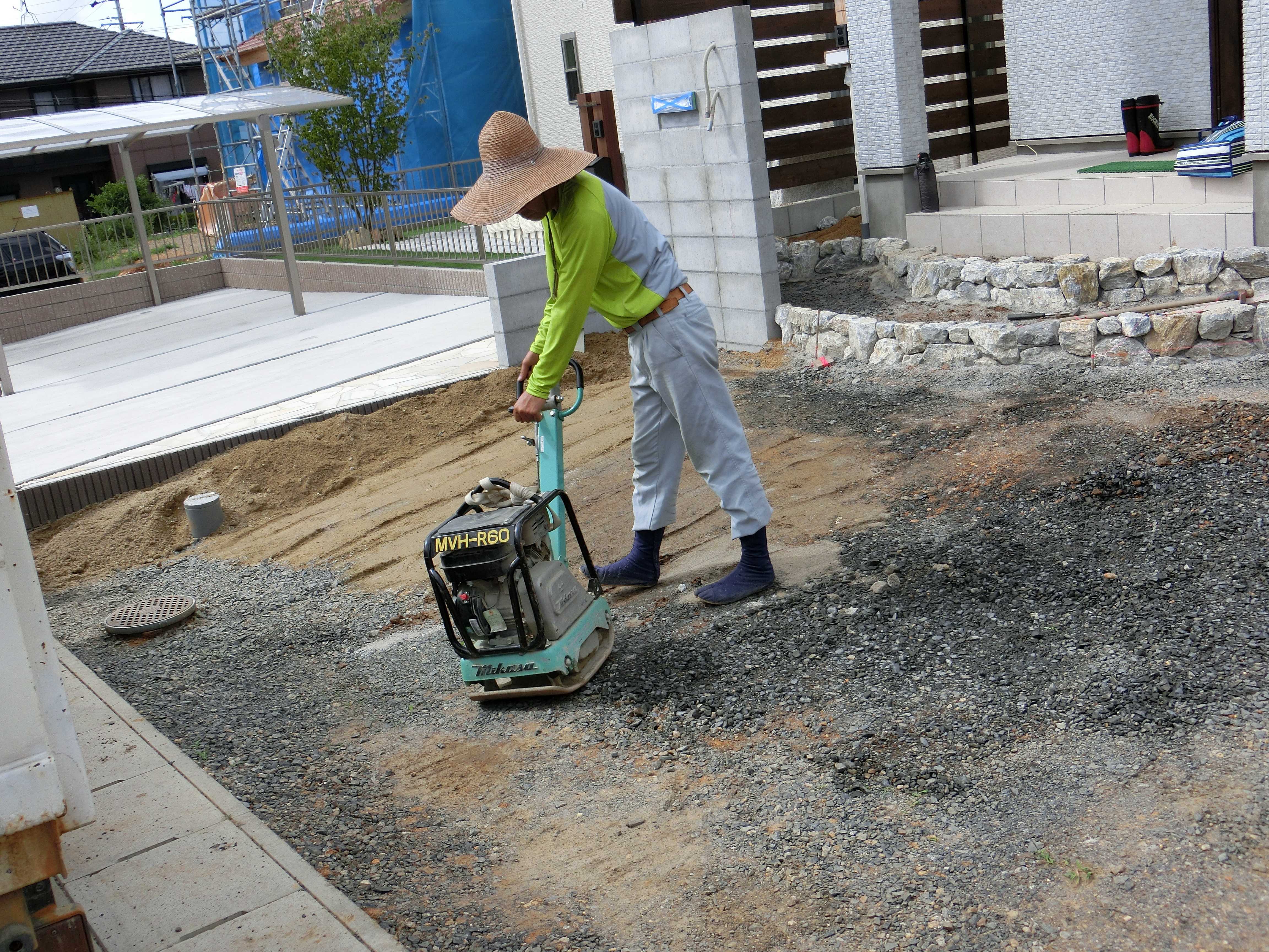 砕石入れと転圧作業東京都江戸川区の新築住宅にて外構工事中三郷市の造園工事・外構リフォーム専門店「庭工房優樹園」。