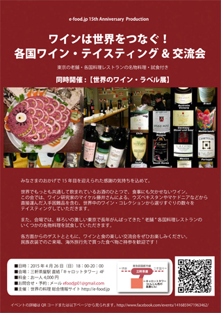 4 26 ワインは世界をつなぐ! 各国ワイン・テイスティング&東京の老舗各国料理店の名物試食&交流会 e-food.jp。