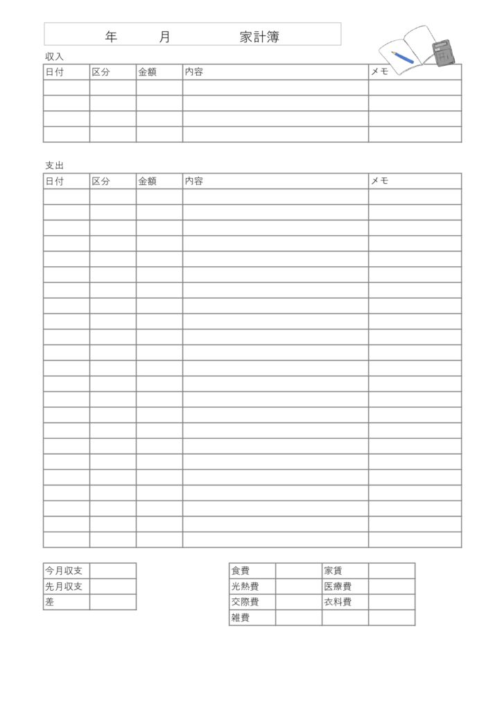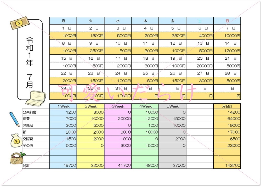 イラスト入り!初心者でも簡単に印刷して手書き対応!家計簿💗無料ダウンロード「かわいい」雛形・テンプレート素材。