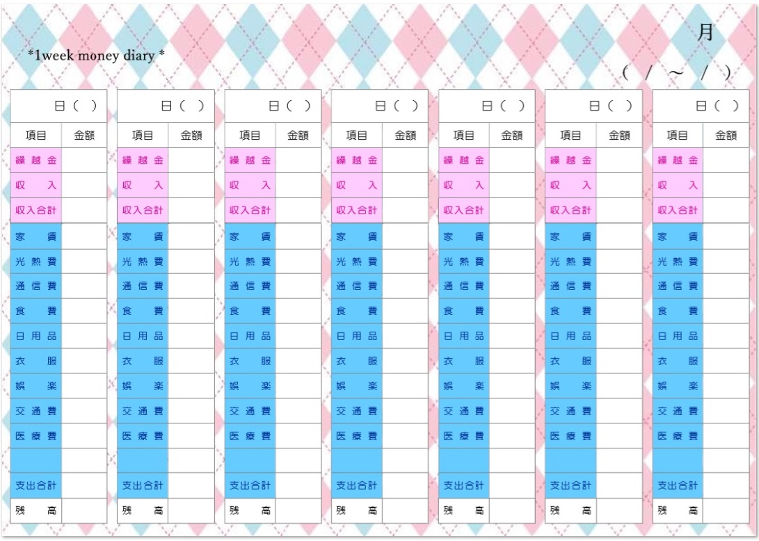 大人かわいい☆背景がアーガイル柄の週間の家計簿テンプレート📑無料ダウンロード!テンプレルン📑無料ダウンロード!テンプレルン。
