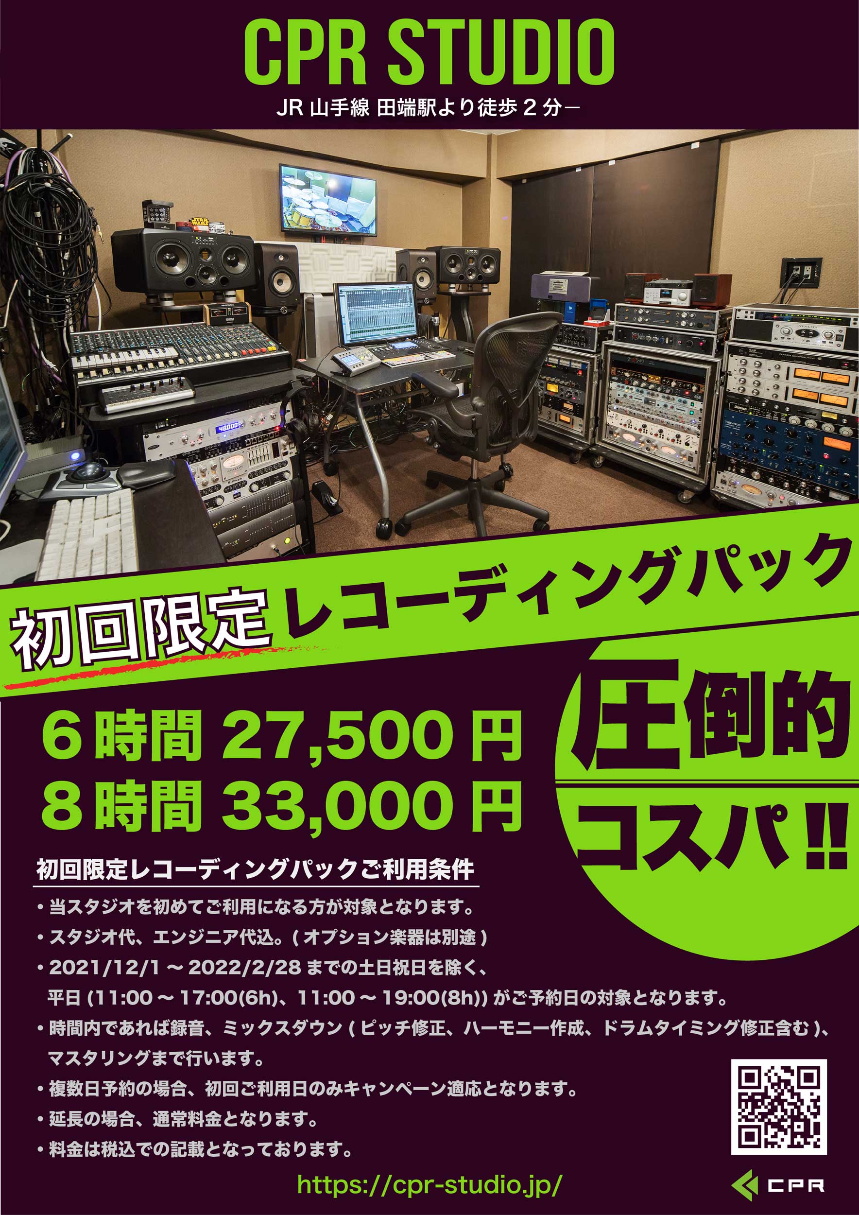 初回限定レコーディングパック 6時間27,500円、8時間33,000円 を2021 12 1から2022 2 28まで実施!! – CPRSTUDIO。
