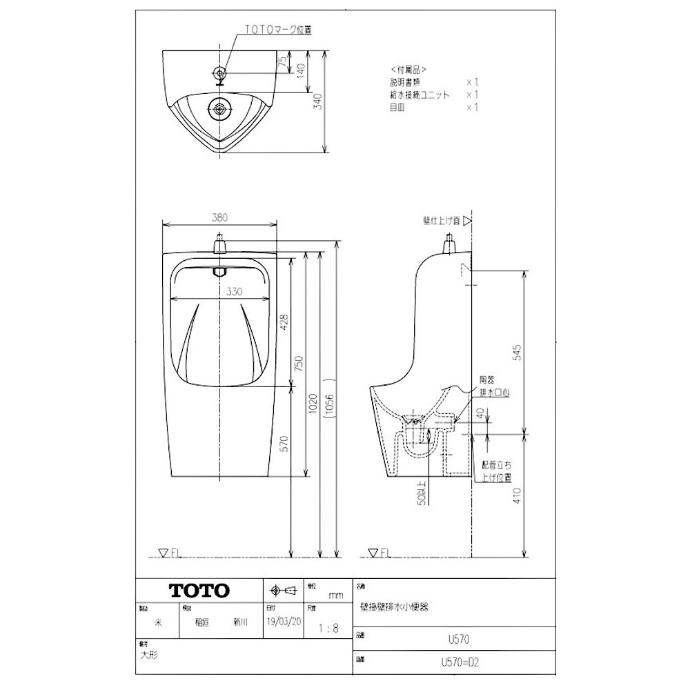 TOTO U570 SC1パステルアイボリー常: 壁掛壁排水小便器 ∴TOTO,Uたね葉本店。