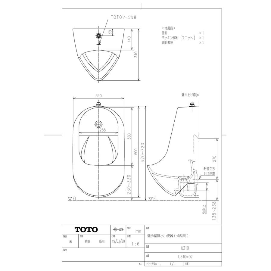 U 310NW1TOTO 壁掛壁排水小便器 幼児用ホワイト яг∀。