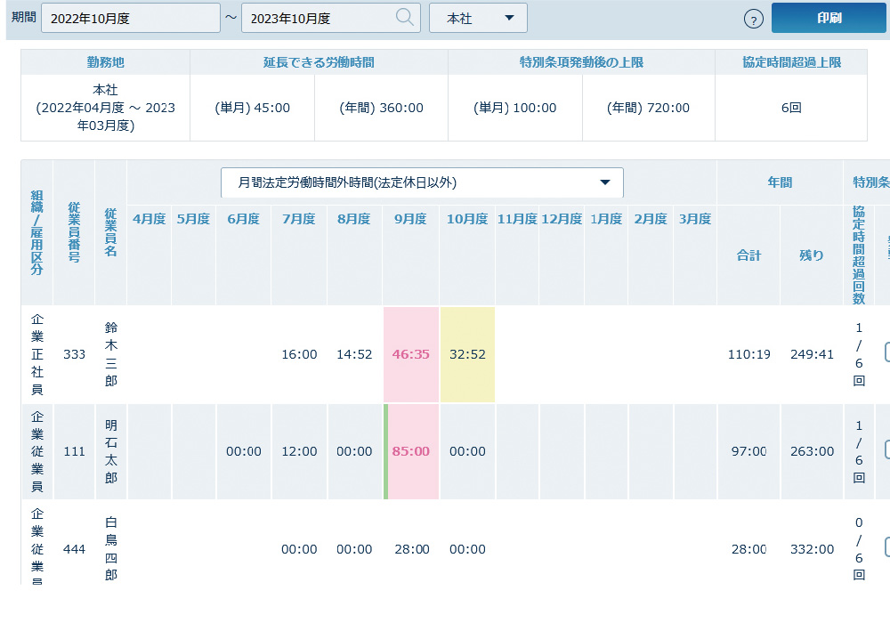 36協定設定主な機能クラウド勤怠管理システム「AKASHI」。