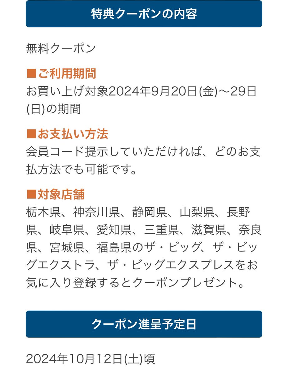 tobibashi على X: "ザ・ビッグお気に入り登録で貰える無料クーポン、今月末2つあるらしいhttps:t.co UW0FrghFJ3"X。