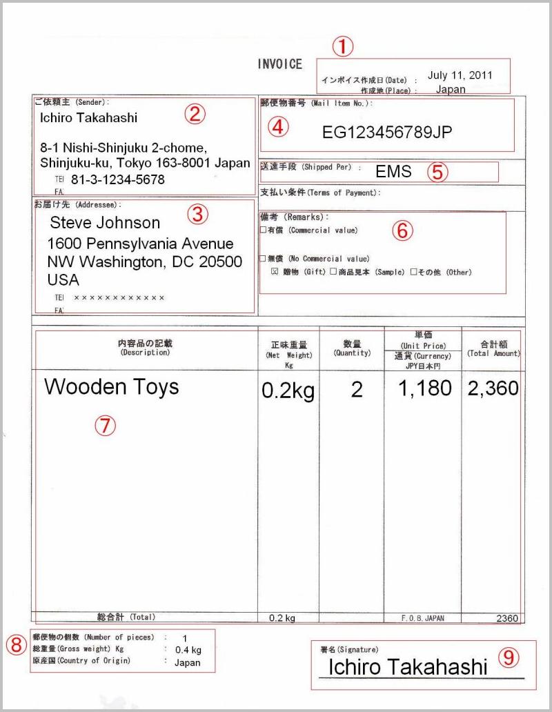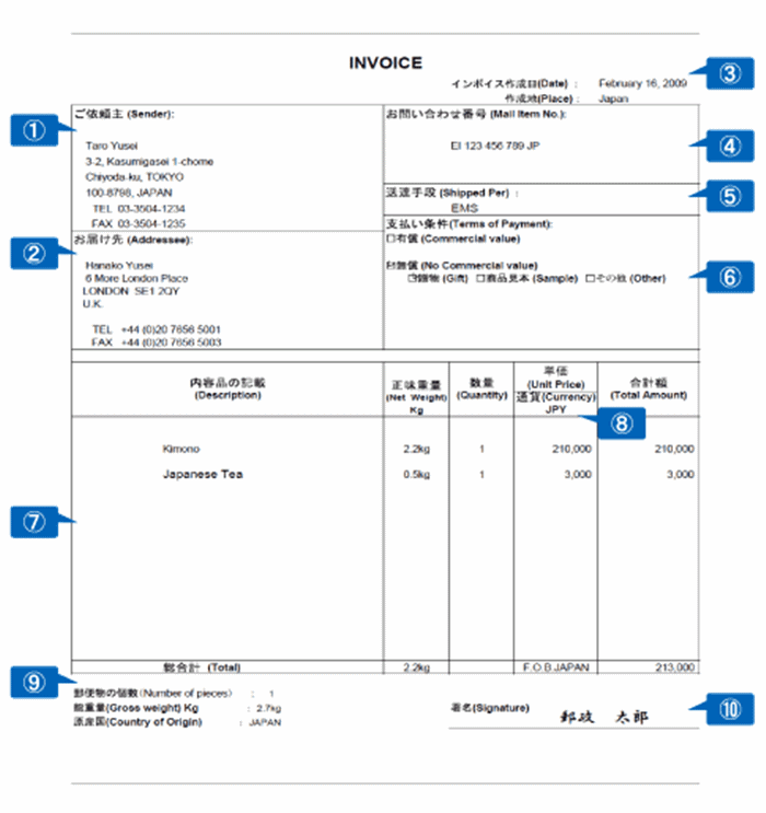 EMS 国際スピード郵便 のインボイスの書き方HUNADE 輸出入と国際輸送ガイド。