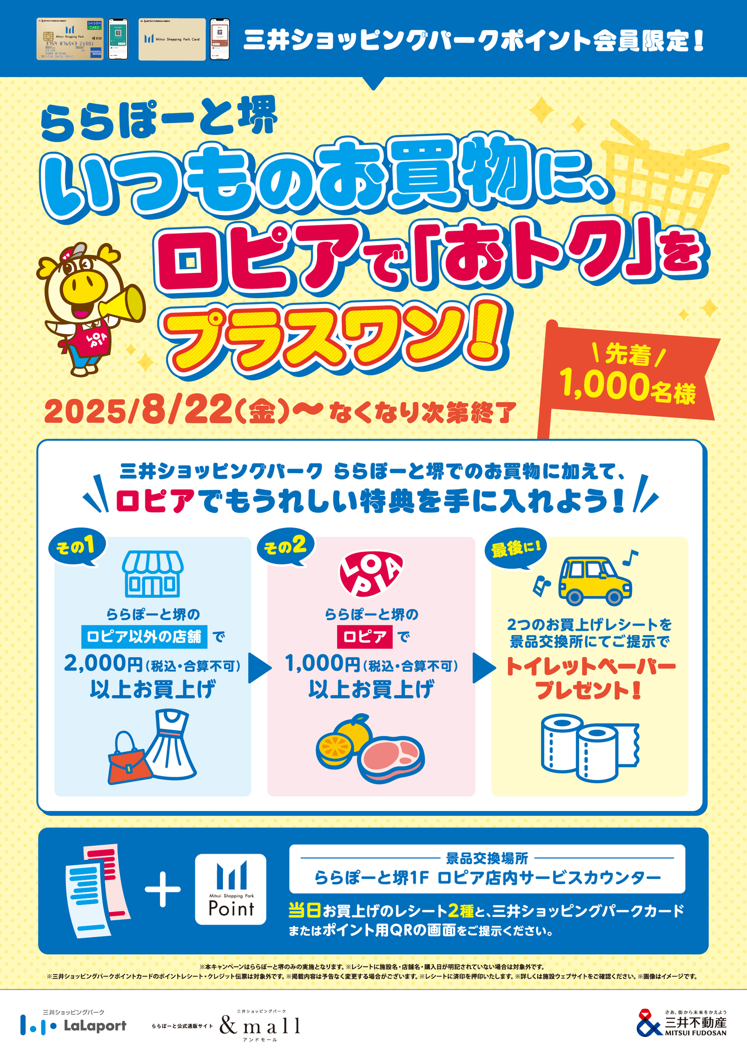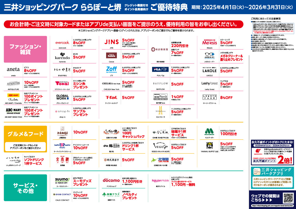三井ショッピングパーク ららぽーと堺 クレジット機能付きポイント会員向けご優待特典ららぽーと堺。