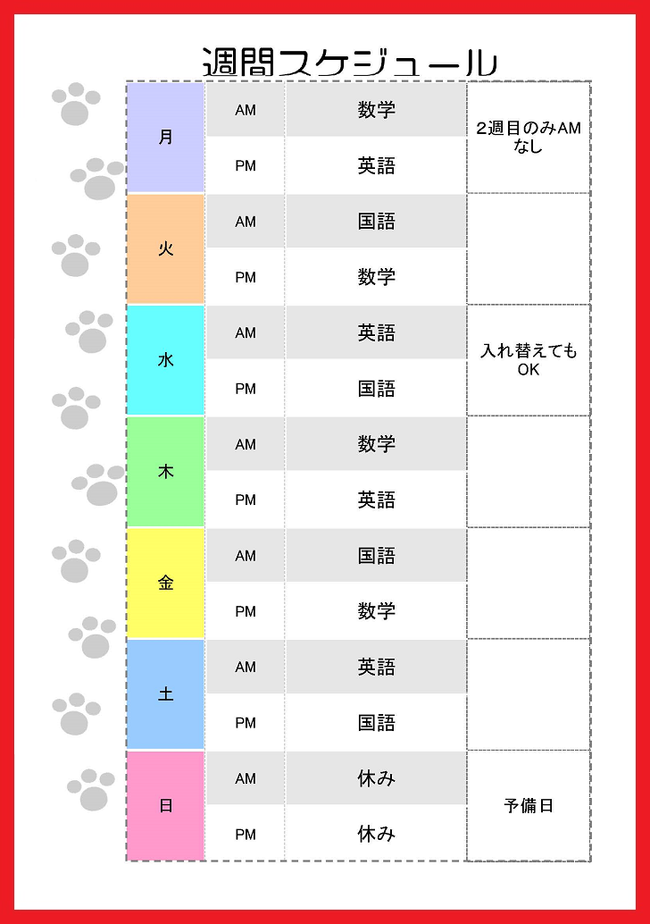 足跡のイラスト入り!1週間スケジュール・エクセルとワード💗無料ダウンロード「かわいい」雛形・テンプレート素材。