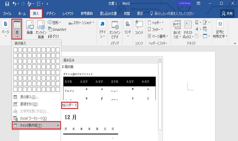 クイック表作成からカレンダーを編集して文書パーツに登録Word 2016初心者のためのOffice講座。