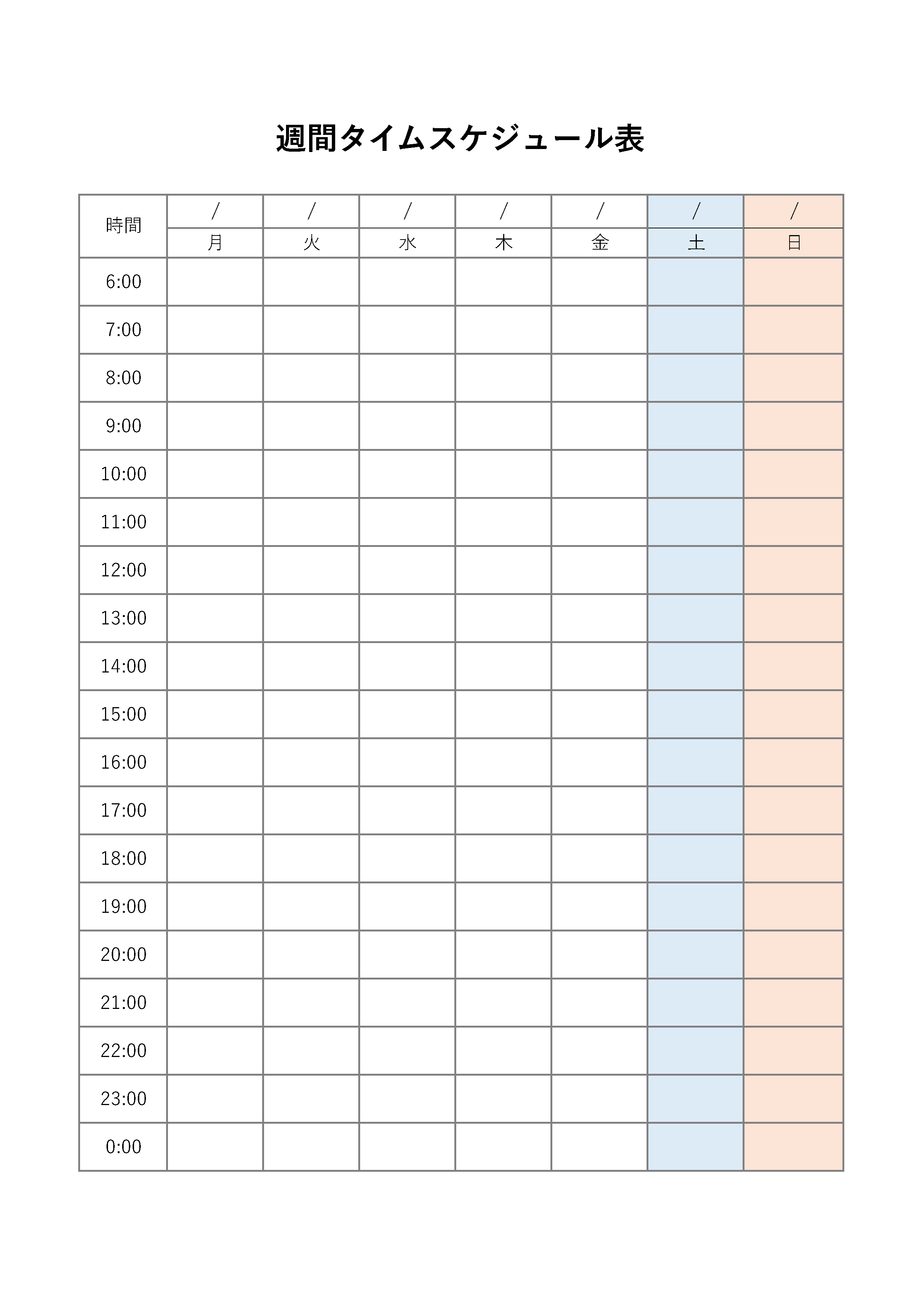 一週間分のタイムスケジュール表「Excel・Word・PDF」としてお使いいただけるテンプレートです。縦軸に時間、横軸に。