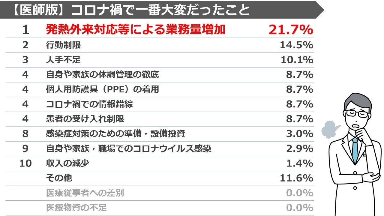医師・看護師が回答!「コロナ禍で一番大変だったこと」に関するアンケート調査結果発表株式会社医師のとものプレスリリース。