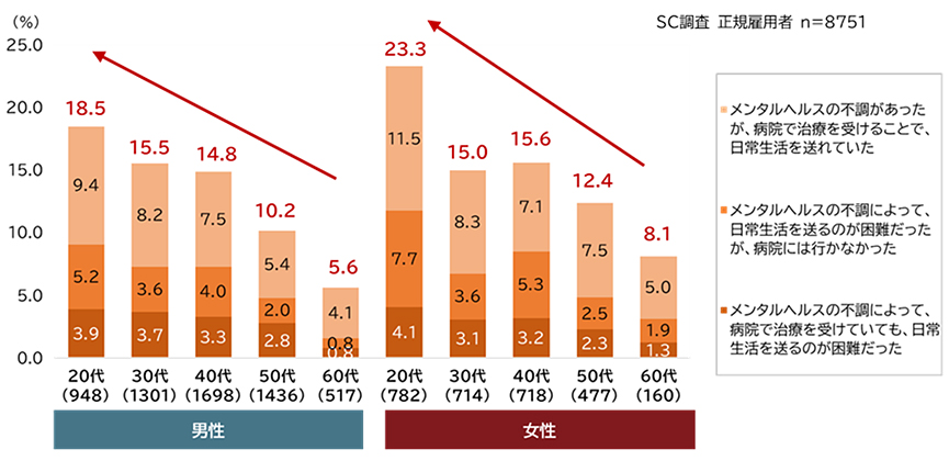 若手従業員のメンタルヘルス不調についての定量調査」を発表若年層で増える深刻なメンタルヘルス不調 - パーソル総合研究所。