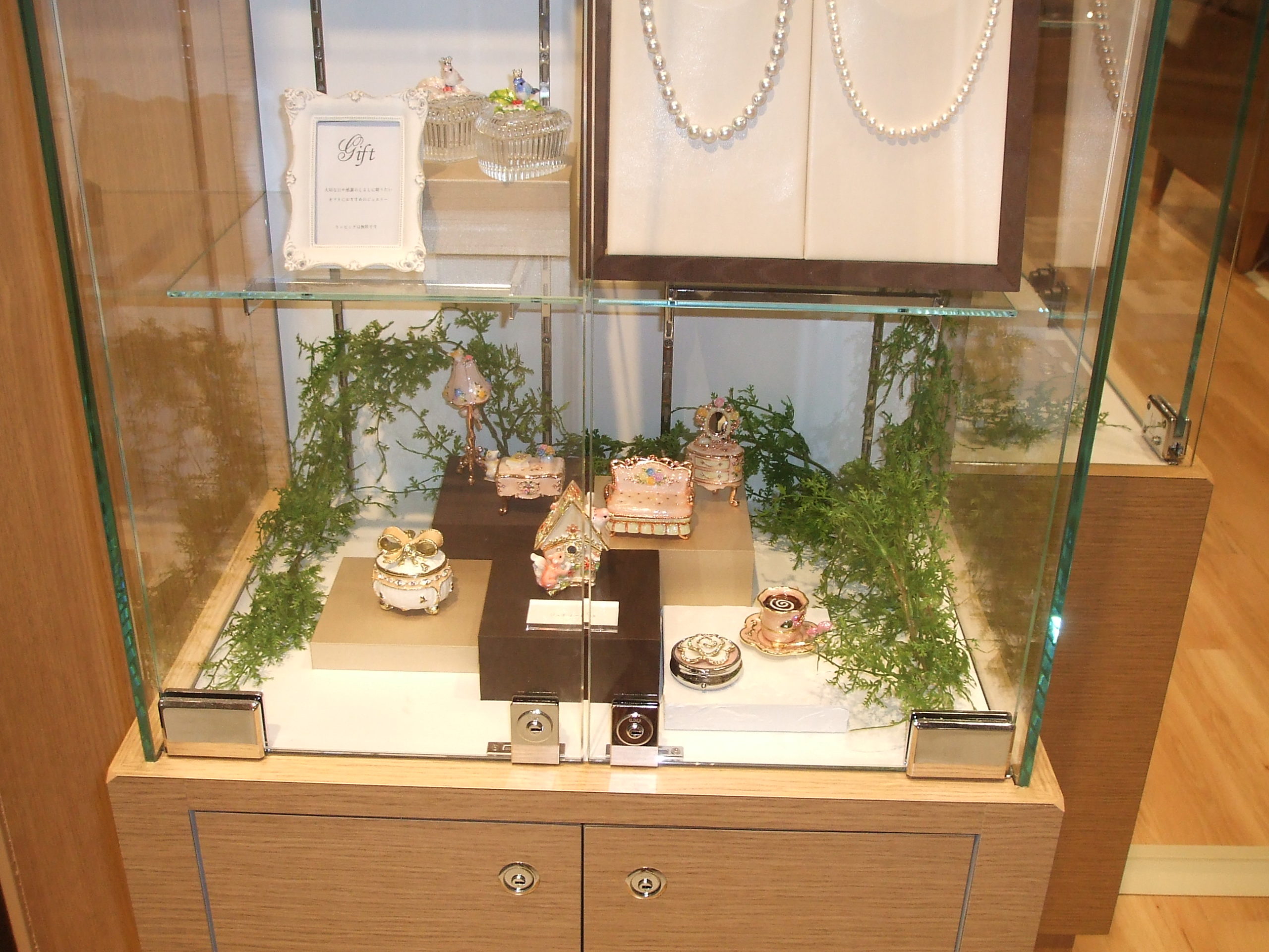 アーティフィシャルフラワーを使った宝石店様の店内ディスプレイ 群馬県高崎市- 花空間装飾 FLOWERDECOR MAKO-WATANABE。