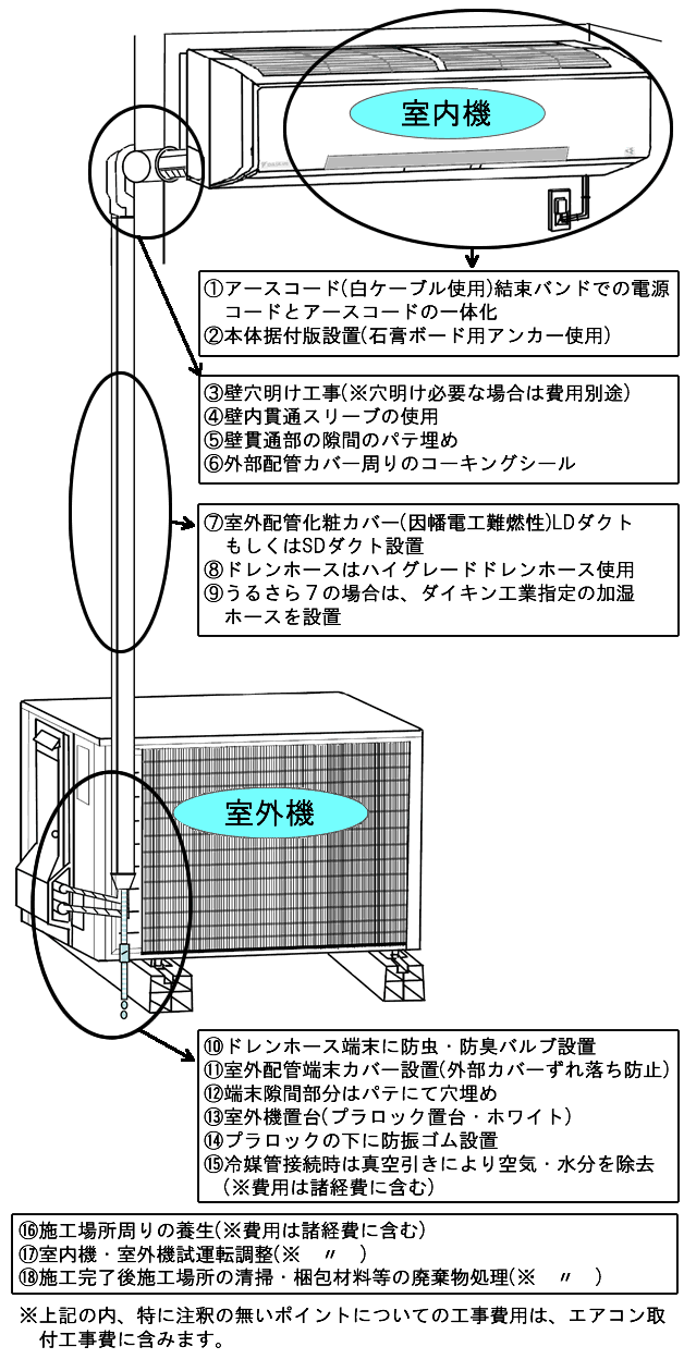 エアコン工事施工のポイント-戸建住宅株式会社富士設備商会-東京、神奈川、埼玉、千葉、茨城のダイキンエアコン。