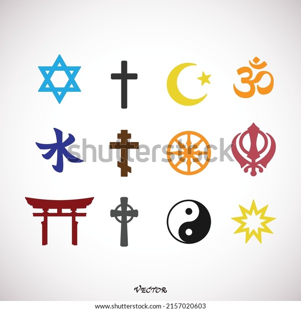 世界の宗教シンボル。主要な宗教団体や宗教の兆候。正統派キリスト教、カトリック、イスラム、ヒンドゥー教、仏教、道教、神道、シーク教、ユダヤ教、儒教、バハーイズム。イラスト」のベクター画像素材 ロイヤリティフリー2157020603Shutterstock。